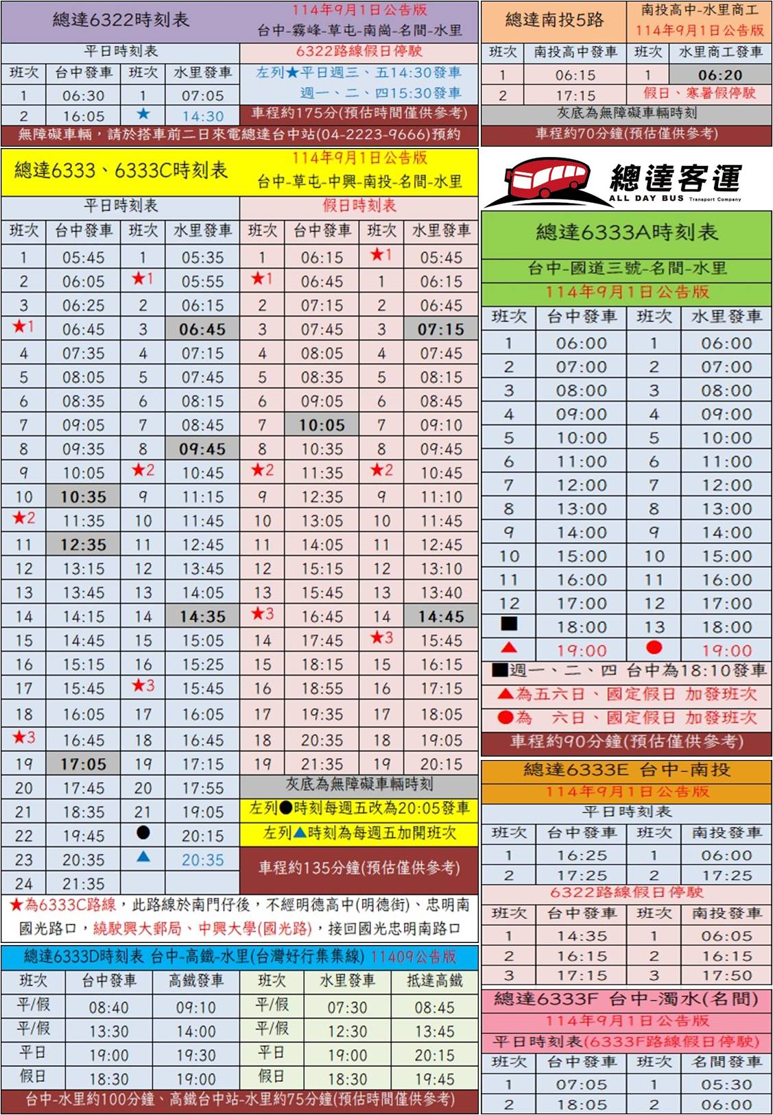 【總達客運公路客運】114年09月起 班次公告重要公告 / 2025.8.26 2025.8.26 一、總達客運114年9月起班次時刻如圖(分為平日及假日時刻)二、6322假日班次停駛三、後續時刻表若無異動,以此份為主,如有調整將再另行公告 總達客運祝您平安順心
