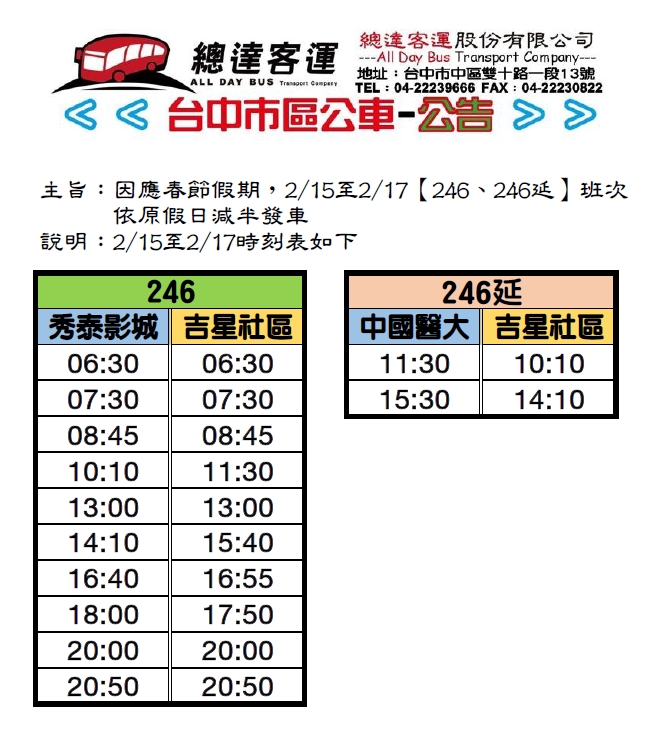 【總達客運台中市區公車246路】115年春節(小年夜~初一)時刻表重要公告 / 2026.1.29 2026.1.29 總達客運246、246延駛,實行路線營運班次調整(1)調整日期:115/02/15(日)-115/02/17(二),時刻如下圖(2)其餘日期班次不變,請參閱原時刻表:https://alldaybus.com/news/2025-11-19-3316/